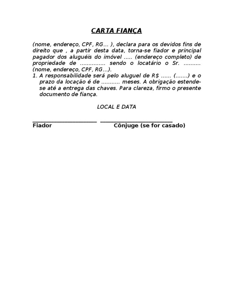Descargar plantilla para contrato de arrendamiento en Word. Clausulas en el contrato de. PARA GARANTIA DE. A carta de fiança é uma modalidade de contrato por meio da qual a instituição financeira assume as obrigações de fiador em um contrato do afiançado. Código Postal.